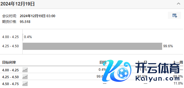 好意思联储将于当地时分12月17日至18日举行本年临了一劣货币策略会,北京时分下周四凌晨3点将表露最新利率水平。好意思联储利率不雅测器清醒,12月好意思联储降息25个基点的概率高达99.6%。