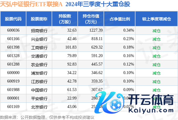 天弘中证银行ETF汇集A为指数型-股票基金,凭证最新一期基金季报暴露,该基金财富竖立:股票占净值比2.21%,债券占净值比0.02%,现款占净值比6.57%。基金十大重仓股如下: