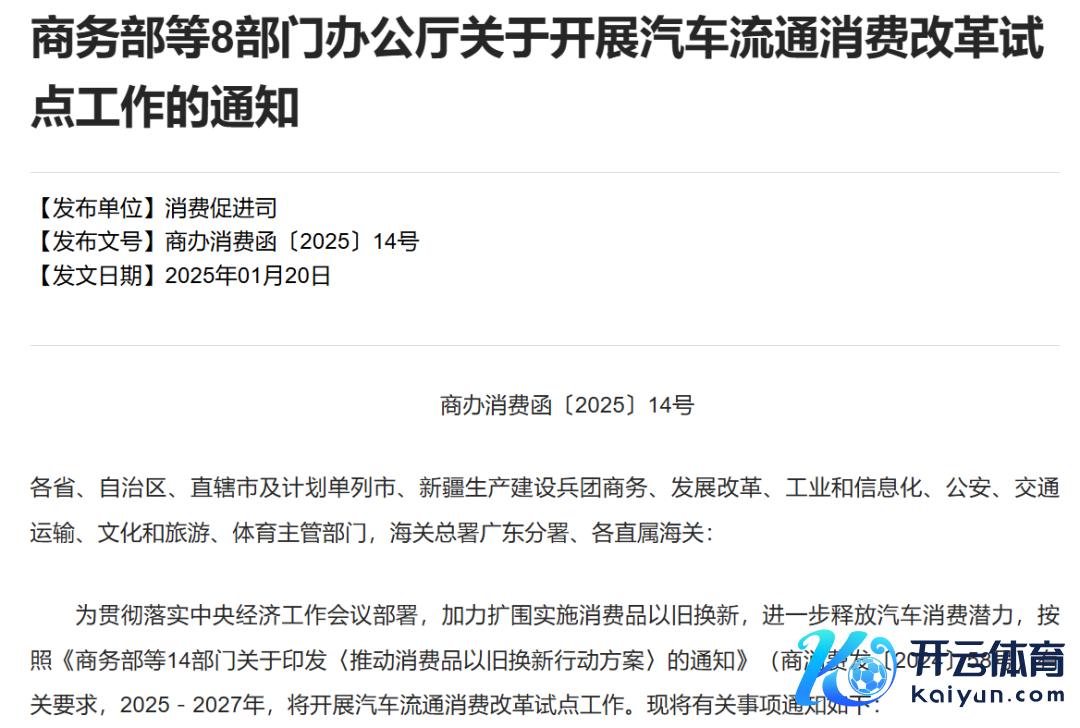 为贯彻落实中央经济责任会议部署,加力扩围实施破钞品以旧换新,进一步开释汽车破钞后劲,按照《商务部等14部门对于印发〈推动破钞品以旧换新行径决议〉的告知》(商破钞发〔2024〕58号)关联要求,2025-2027年,将开展汽车运动破钞纠正试点责任。现将关联事项告知如下: