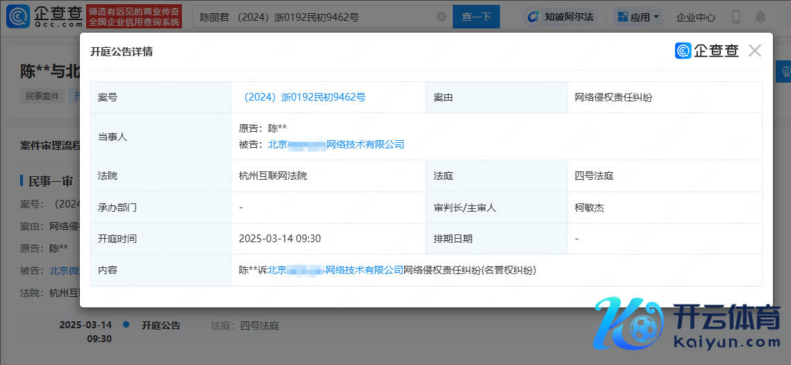 2月15日云开体育,陈丽君请托讼师团队发布声明称,针对收集上抓续传播的侮辱、捏造等空虚信息,已慎重运行法律维权设施。 企查查APP融会,陈丽君已对某收集平台发起收集侵权包袱纠纷(名誉权纠纷)维权,该案筹谋将于3月14日开庭审理。