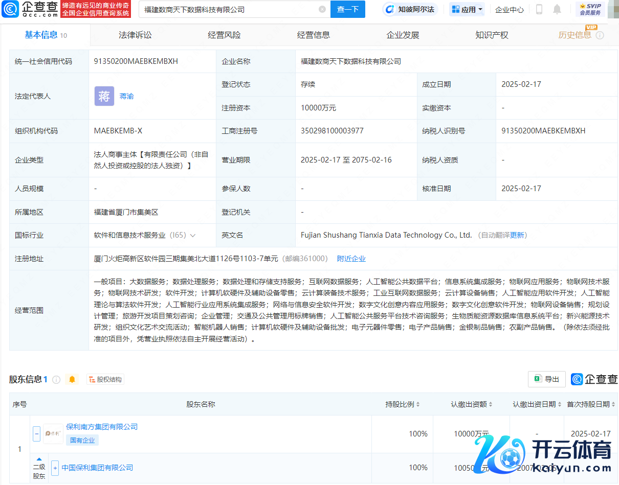企查查APP裸露,近日,福建数商六合数据科技有限公司设置开云体育(中国)官方网站,法定代表东谈主为蒋渝,注册成本为1亿元,计较限制包含:大数据行状;数据措置行状;数据措置和存储撑握行状;互联网数据行状;东谈主工智能全球数据平台;东谈主工智能诳骗软件拓荒等。企查查股权穿透裸露,该公司由中国保利集团有限公司波折全资握股。