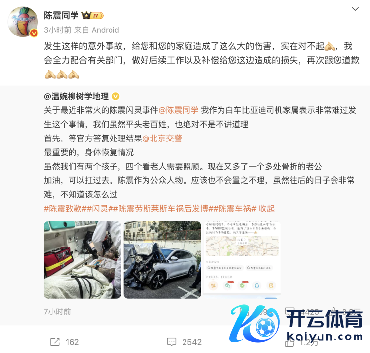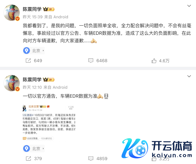 10月4日,@陈震同学 转发北京交警的通报,连发两条微博,暗示“我王人看到了,是我的问题,一切负面照单全收,全力阿谀贬责问题中,不会有涓滴懈怠,事故经由以官方公告、车辆EDR数据为准,酿成了这样大的负面影响,在此向对方车辆说念歉,向天下景歉……”(北京日报微信公号)